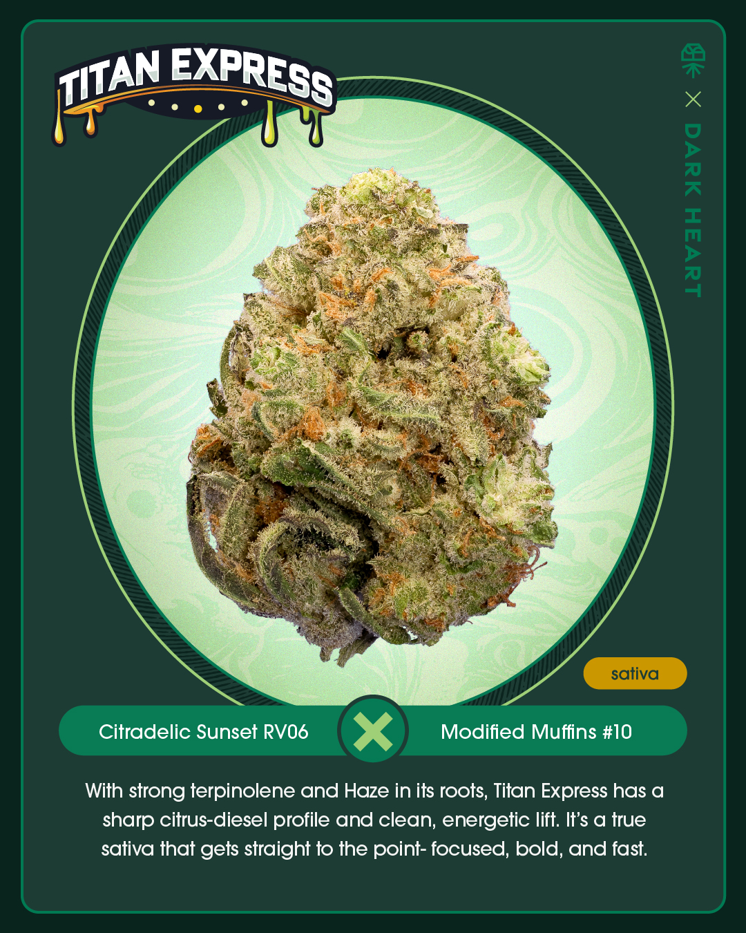 Forged from Haze genetics and powered by terpinolene, Titan Express delivers an unmistakable sativa rush with bold, wake-you-up energy.