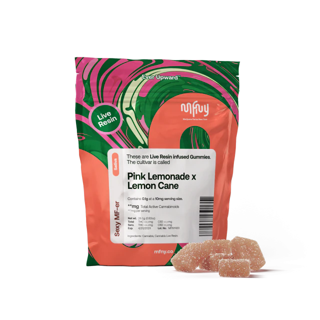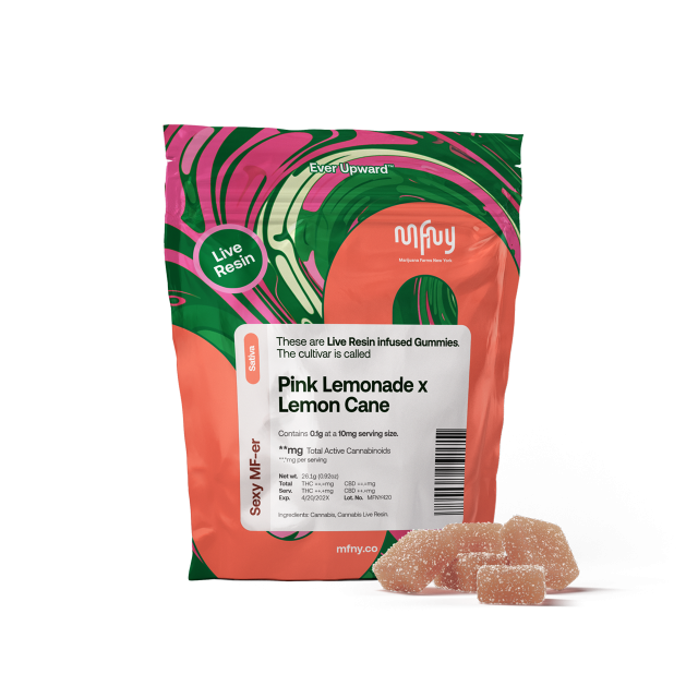 Terpene-rich edibles at an even tastier price. Introducing our live resin Pink Lemonade x Lemon Cane gummies. These vegan gummies are infused with MFNY’s single-source, in-house produced Lemon Cane live resin. We start with fresh-frozen flower buds, then use the hydrocarbon extraction method (plus years of experience and scientific precision) to deliver the purest plant extract. An extract that showcases the cultivar's naturally-produced, full-spectrum cannabinoids and remarkable natural terpenes. Lemon Cane is known for its spicy pineapple flavor. To complement the Lemon Cane cultivar, we add the minimum amount of sugar and Pink Lemonade flavors.
