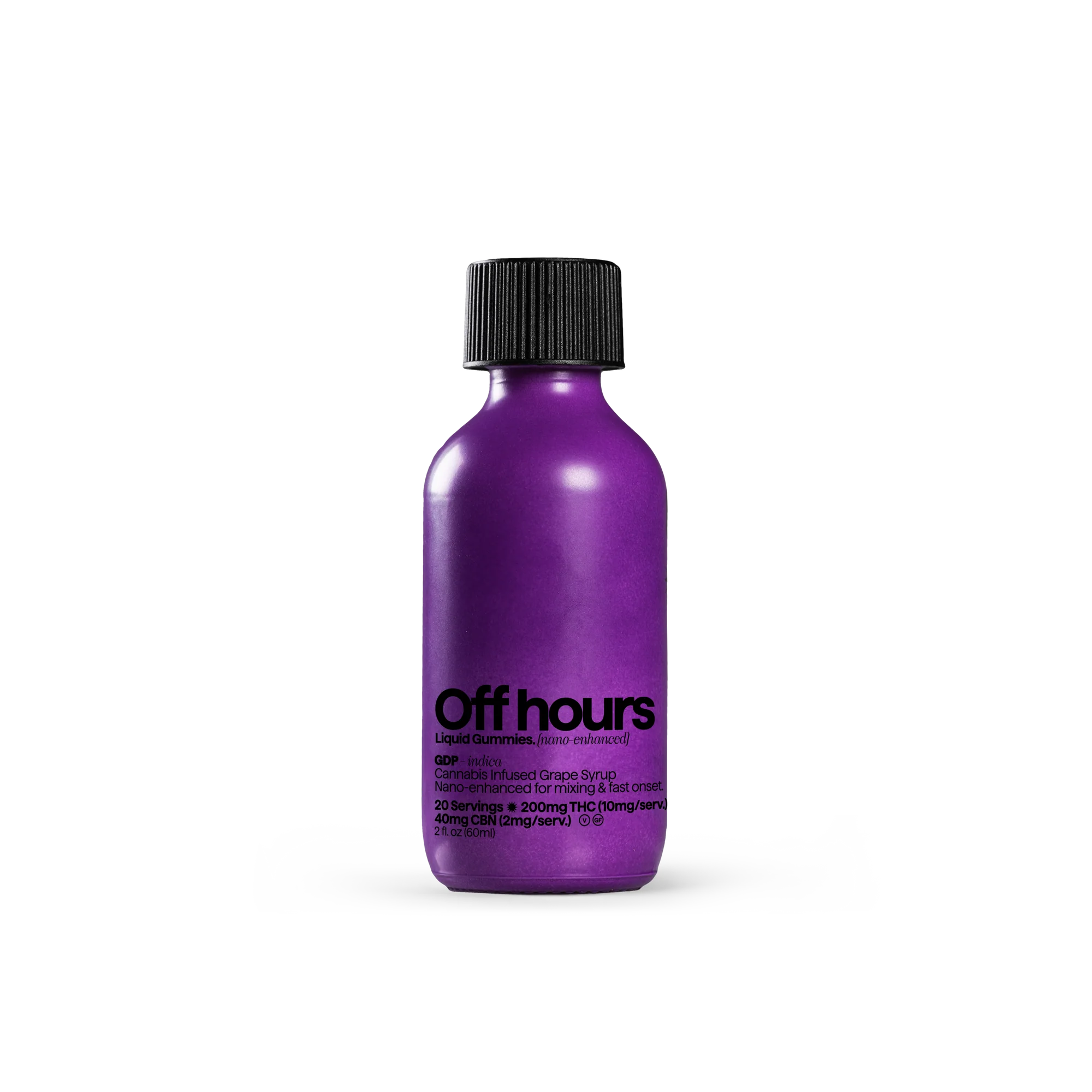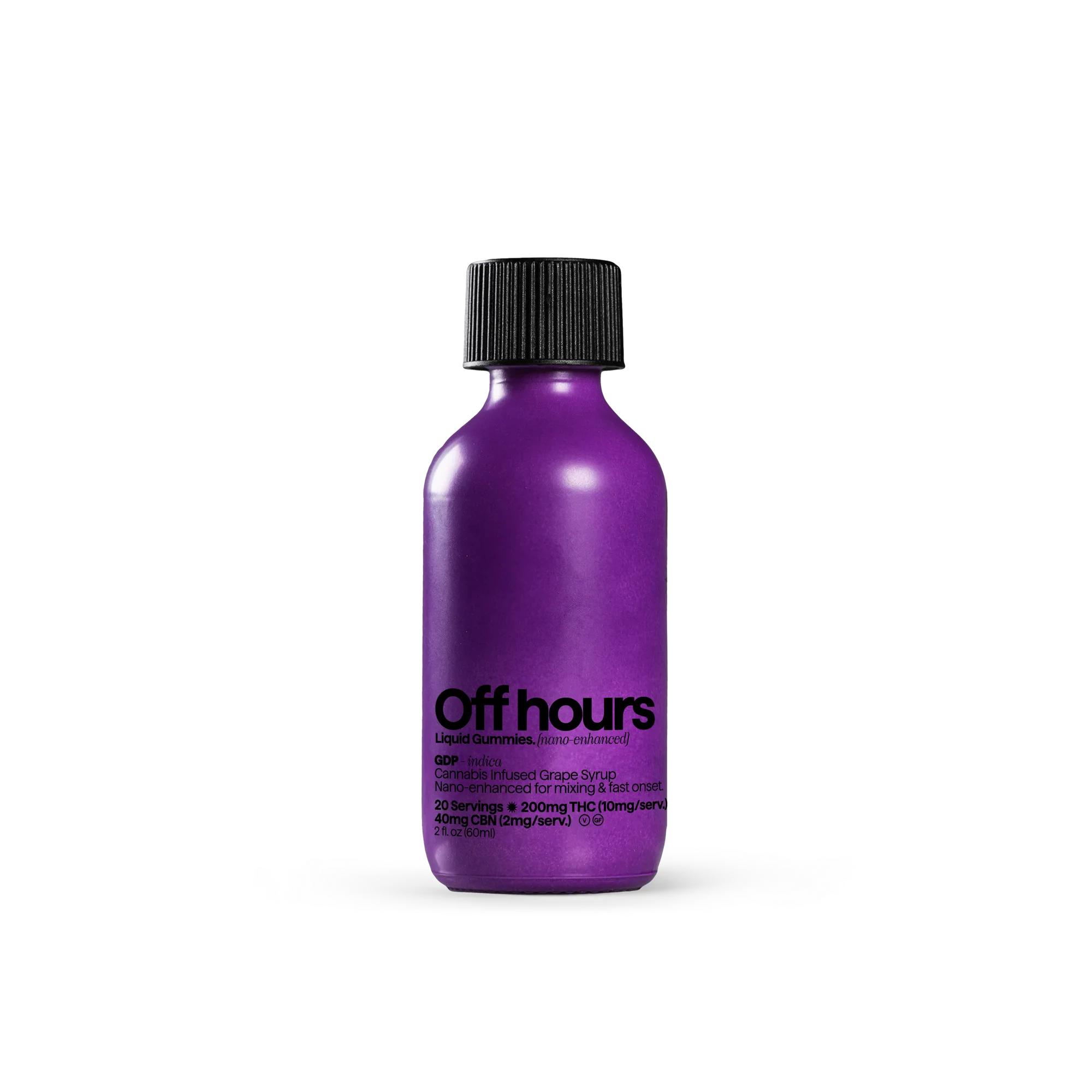 FLAVOR: Grape TERPENES: Granddaddy Purp SIZE: 60ml STRENGTH: 200MG THC (10MG/SERVING) + 40MG CBN (2MG/SERVING) INGREDIENTS:Organic Agave Syrup, Reverse Osmosis Water, Natural Flavor and Color, MCT Oil, Cannabis Extract, Soy Extract, Terpenes
