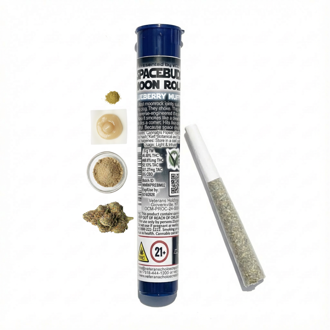 Blast off with Blueberry Muffin, a Moonrock infused pre-roll that smells like fresh blueberries and hits like a comet. Packed with top-shelf flower, bubble hash, rosin and injected with our potent Moon Matter, this 1.5g joint delivers a smooth, flavorful ride from spark to finish. It’s slow burning, strong, and perfect for floating through the day with your head in the clouds and a grin on your face.